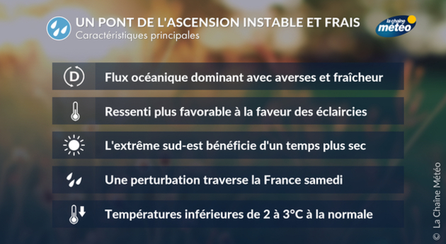 Comme la fête de Pâques, l’Ascension est une date variable d’une année sur l’autre. Elle se situe entre le début ou la fin du mois de mai. Cette variabilité conditionne dès lors la météo du pont de l’Ascension. Ainsi l’année dernière, le jeudi de l’Ascension tombait le 21 mai et fut marqué par un gros coup de chaleur avec 25° à 30°C sur toute la France. En 2019, pour l’Ascension le 30 mai, le temps était moins chaud avec 20° à 25°C…ce qui était de saison. En 2018, l’Ascension tombait le 10 mai à peu près comme cette année. Les températures étaient globalement de saison, avec de 15° à 23°C du nord au sud.