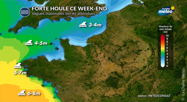 Ce fort coup de vent sera associé à une forte houle d’ouest qui atteindra 5 à 8 mètres en Bretagne et sur nord Gascogne, 4 à 5 mètres sur Manche ouest et autour de 3 à 4 mètres sur Manche est. Ce phénomène coïncidera avec les grandes marées, présentant des coefficients dépassant 100. Le risque de submersion s’annonce très élevé en Vendée et sur les côtes sud de la Bretagne, sur les départements du Finistère et du Morbihan. Dans un contexte de vacances scolaires, les balades sur les plages seront fortement déconseillées, en raison de cette situation très agitée entre samedi matin et ce dimanche 12h.