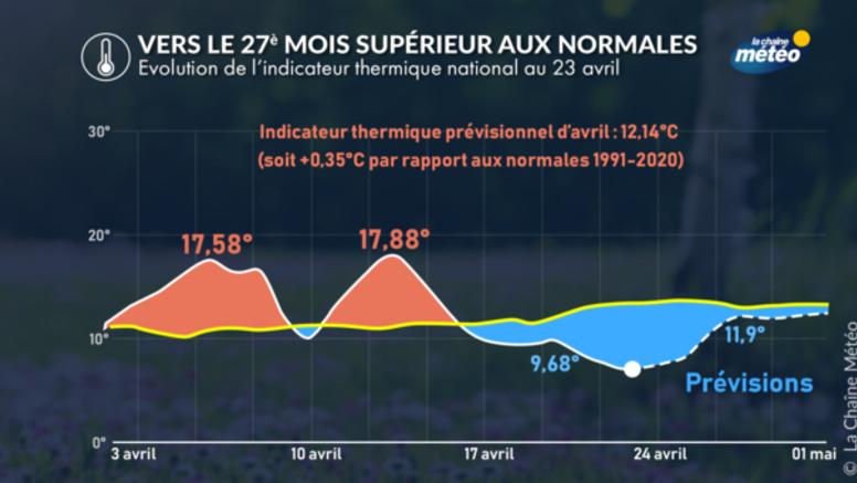 Il faudra attendre le 30 avril afin de déterminer avec précisions l'indicateur mensuel du mois. Il nous paraît néanmoins fiable, à ce jour, qu'entre la chaleur record de la première quinzaine et le froid actuel, avril termine légèrement excédentaire (+0,35 °C), comme l'ont été tous les mois depuis janvier 2022. Une situation (à nouveau) inédite.