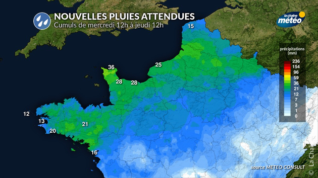 Une énième perturbation concerne le nord-ouest du pays ce mercredi. Les pluies ont repris dans la matinée en Bretagne et se poursuivront jusqu’en milieu d’après-midi avant qu’un régime d’averses prenne le relais. À midi, il était déjà tombé de 10 à 20 mm sur les bassins versants de la Vilaine et de la Seiche. Les pluies continues de cet après-midi seront suivies d’averses parfois fortes et orageuses ce soir et la nuit prochaine. On attend sur les prochaines 24h de 20 à 30 mm supplémentaires sur l'île-de-Vilaine et le Morbihan. Le niveau des cours d’eau continuera donc à monter ces prochaines heures et le pic de crue est attendu entre ce jeudi matin et soir sur l’ensemble du bassin versant. Le niveau dépassera vraisemblablement le niveau de la crue historique de 1936, ce qui montre le caractère exceptionnel de cet évènement.