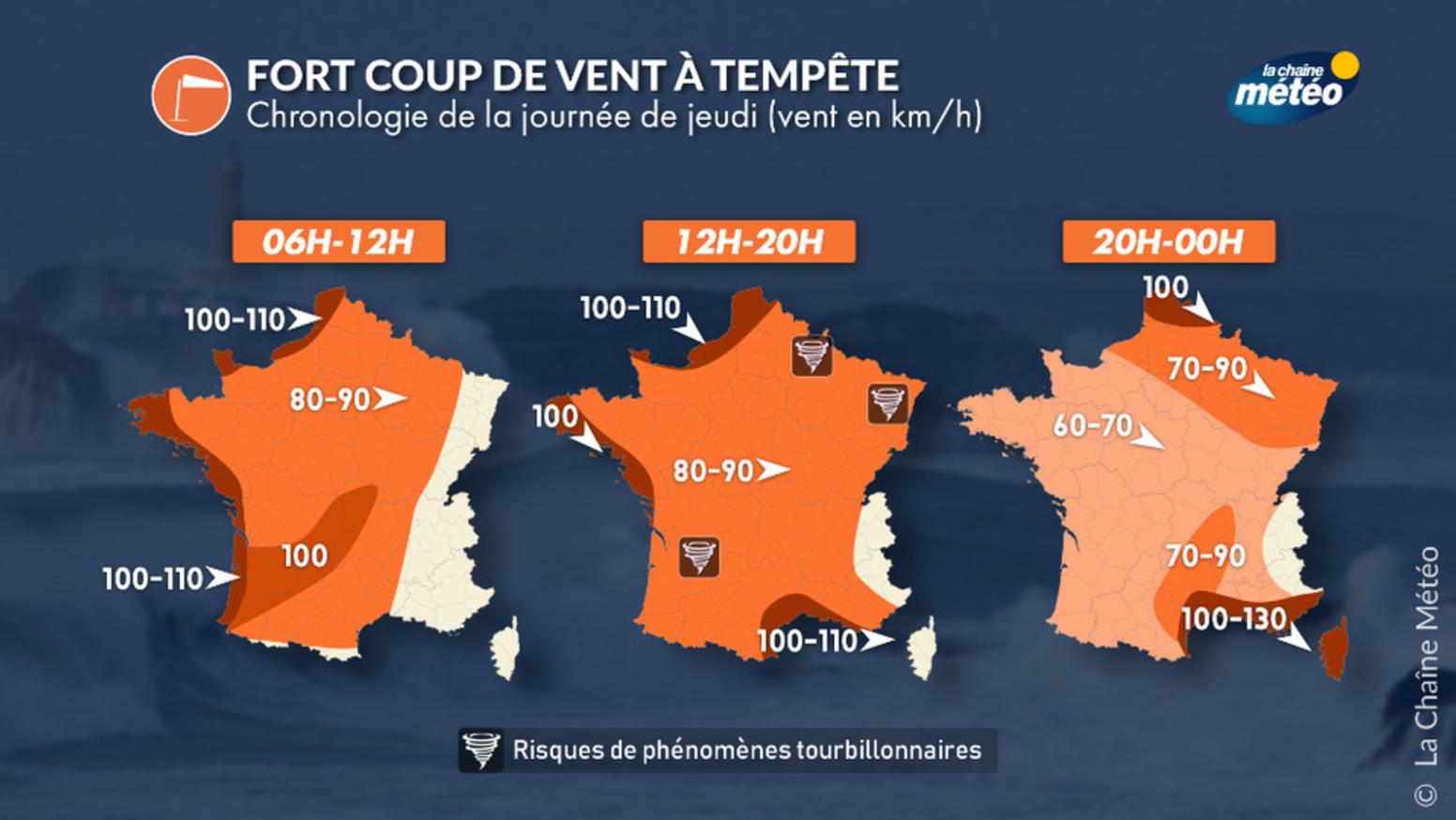 Le renforcement du vent débutera dès la fin de nuit de mercredi à jeudi sur la façade atlantique, notamment entre la Bretagne et la Gironde, ainsi que le long des côtes de la Manche. Le pic de l’épisode est attendu dans la matinée, entre 6 h et 12 h, lorsque le front pluvieux et orageux balayera les deux tiers ouest du pays. En milieu de journée, les rafales les plus fortes se décaleront vers le centre, la vallée de la Loire et le nord-est, avant qu'un déferlement de vent ne se mette en place en cours d'après-midi et le soir près de la Méditerranée puis la Corse, avec là aussi localement des rafales tempétueuses.