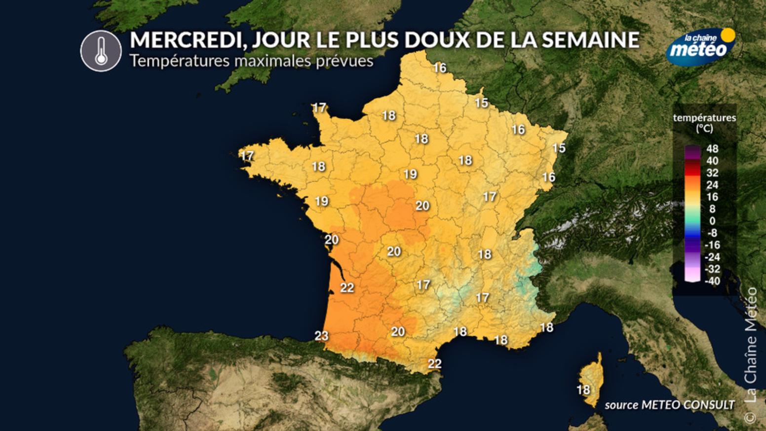 Après une journée de mardi déjà douce, le point culminant sera atteint mercredi. Les températures l'après-midi se situeront entre 16 et 20°C dans le nord et de 20 à 24°C au sud. C'est de nouveau dans le sud-ouest qu'il fera le plus doux. Par effet de foehn, les valeurs entre 25 et 27°C sont envisagées entre le Béarn et la Bigorre.