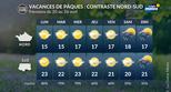 Ce lundi après-midi, les écarts de températures sont particulièrement marqués. Au nord de la Loire et près de la Manche, les valeurs restent fraîches avec 12 à 16°C, sous l’influence de l’air frais véhiculé par une bise de nord-est modérée. Sur les régions centrales, les températures sont comprises entre 16 et 18°C. Un contraste de températures important se met en place sur le nord de la Nouvelle- Aquitaine avec 18°C à La Rochelle mais 24°C à Bordeaux. Des pointes à 26-27°C sont possibles des Landes à l'arrière-pays méditerranéen.