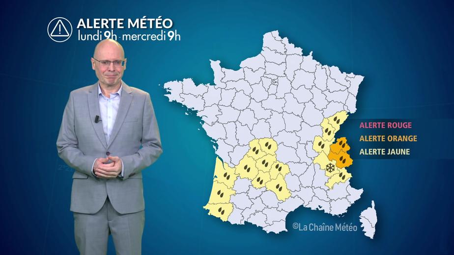 Une perturbation très active venant de l'Atlantique provoque un épisode de pluies durables et abondantes de l'Aquitaine à Rhône-Alpes au Jura jusqu'à mardi, pouvant entraîner des ruissellements importants, voire quelques inondations ponctuelles, d'ailleurs, Vigicrues passe plusieurs tronçons en alerte ce lundi. En montagne, de nouvelles conditions de blizzard s'installent sur le nord des Alpes, et dans une moindre mesure sur le Jura et les Pyrénées à partir de lundi après-midi.